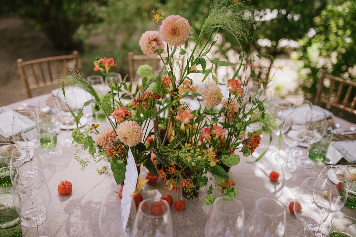 Marta y Ramón eligieron mezclar mesas redondas y mesas alargadas, decoradas con mantel beige para no condicionar la decoración floral, y sillas modelo Tiffany en color marrón oscuro.