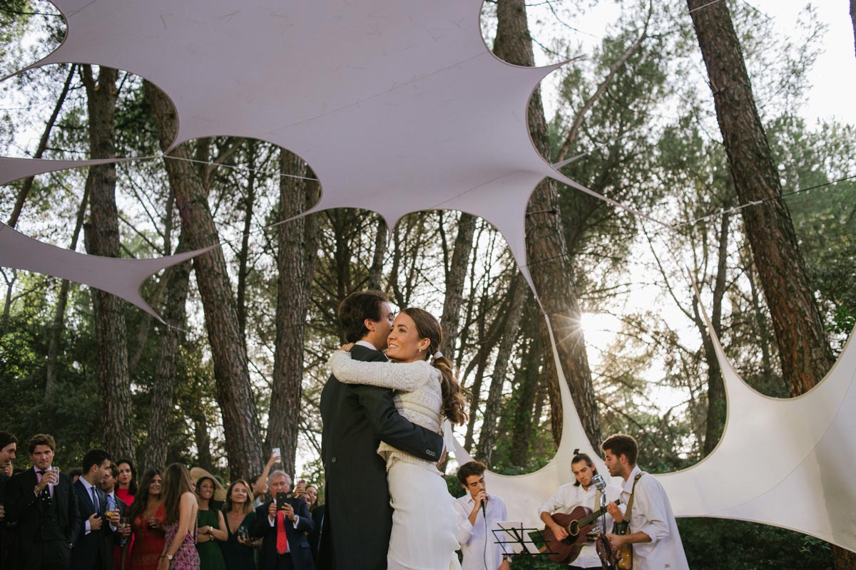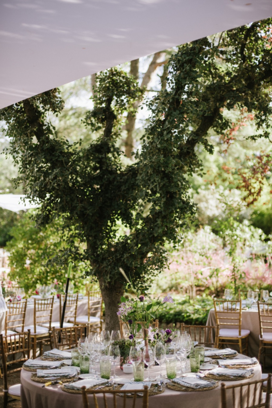 Querían una celebración al aire libre con un toque diferente, por lo pusieron velas a modo de carpa en todo el jardín y crearon tres ambientes distintos: uno para el cóctel, otro para la comida y otro para el baile.