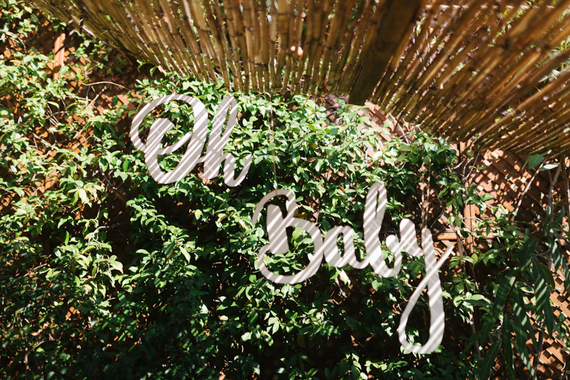 Saray vino unas horas antes y me ayudó con el montaje. Colgamos un cartel de madera, que encargué a Knots made with love, en la pérgola que había encima de la mesa y junto a la pared. Estaba separado en dos palabras para que fuera más fácil de transportar y porque da libertad de poner las dos palabras a distintas alturas, una encima de la otra o seguidas. Los días anteriores habíamos estado probando distintos tipos de letra y tamaños y la verdad es que creo que quedó perfecto para lo que quería.
